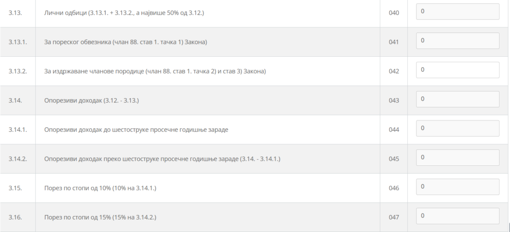 Nakon umanjenja za lične odbitke iskazuje se oporezivi dohodak na rb. 3.14. i obračunava porez po propisanim poreskim stopama.